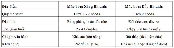– Chọn máy bơm DẦU Hakuda khi: Bạn tưới diện tích lớn (cà phê, sầu riêng, tiêu quy mô lớn), rẫy dốc cao, cần máy hoạt động bền bỉ suốt mùa khô và muốn tối ưu hóa chi phí nhiên liệu về lâu dài.