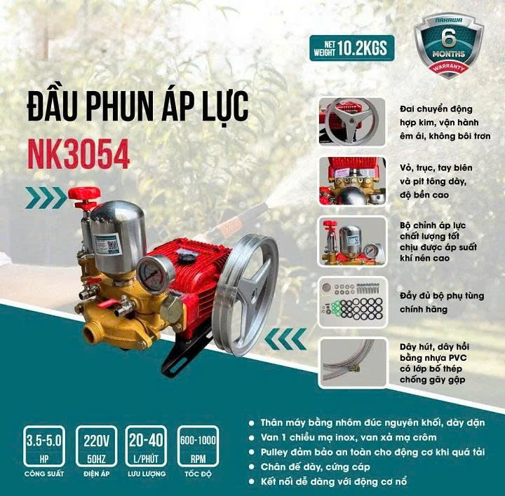 – Đầu Phun Xịt Áp Lực Nakawa 3.5HP NK-3054 là dòng đầu xịt rửa cao áp chuyên dụng, được thiết kế phục vụ nhu cầu rửa xe, vệ sinh chuồng trại, xịt rửa công nghiệp và nông nghiệp.