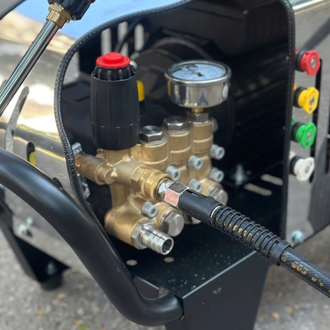 - Áp Lực Làm Việc Cao (Max ~150 Bar): Áp lực ổn định, dễ dàng đánh bay bùn đất, dầu mỡ và các mảng bám cứng đầu trên thân xe, gầm xe hoặc sàn xưởng.