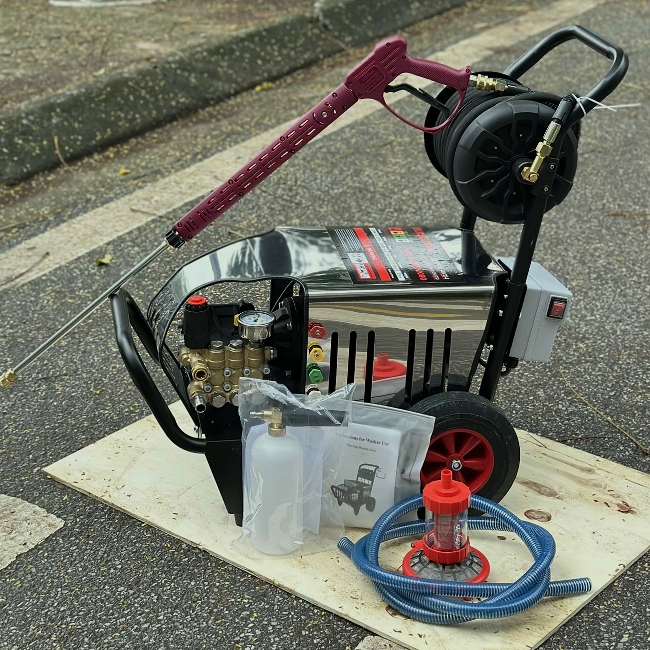– Phụ kiện đi kèm của máy rửa xe như: dây phun áp lực, súng phun, béc phun, đồng hồ đo áp, cút nối nguồn nước và bình đựng hóa chất,…